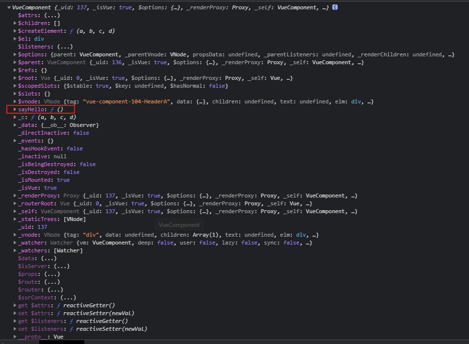 } }, methods:{ btnclick() { console.log(this.$parent) }, sayHello(){ console.log('abcd') }, }, } </script>